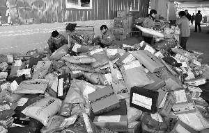 快递员在江苏南通市一家快递公司的派送件现场分拣快件(资料图片)新华社发