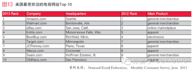 根据美国“FAVORITE 50”最受欢迎的50家电子商务网站排名:排名前10位的网站中,除Amazon(B2C)和eBay(C2C)外,其余均为传统线下零售企业;