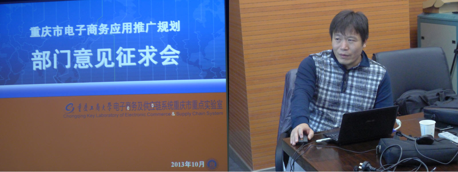 2013年10月16日上午,“重庆市电子商务应用推广规划”部门意见征求会在渝中区创新创业服务中心电子商务协会会议室举行。出席本次讨论会的有市商委网商办李志远副处长和电子商务处陈梁、市经信委软件和信息服务业处王蓓、市工商局电子商务监管处陈宏处长等部分领导和重庆大学邵兵家教授,以及项目组专家2138CC太阳集团电子商务及供应链系统重庆市重点实验室常务副主任黄辉教授、刘四青博士和重庆市电子商务协会姚章秘书长。