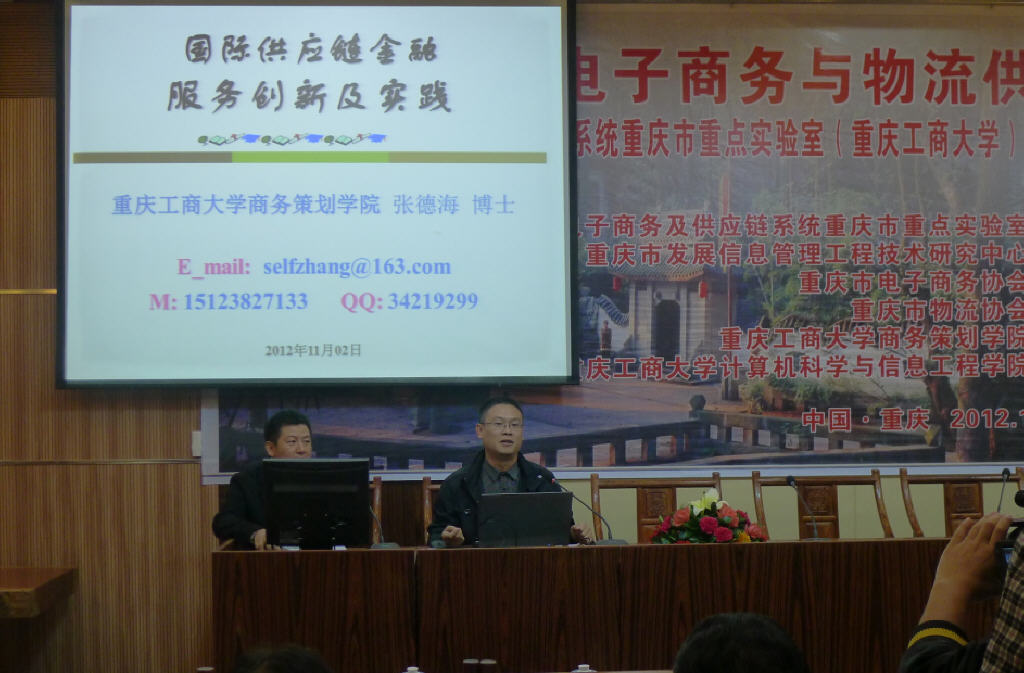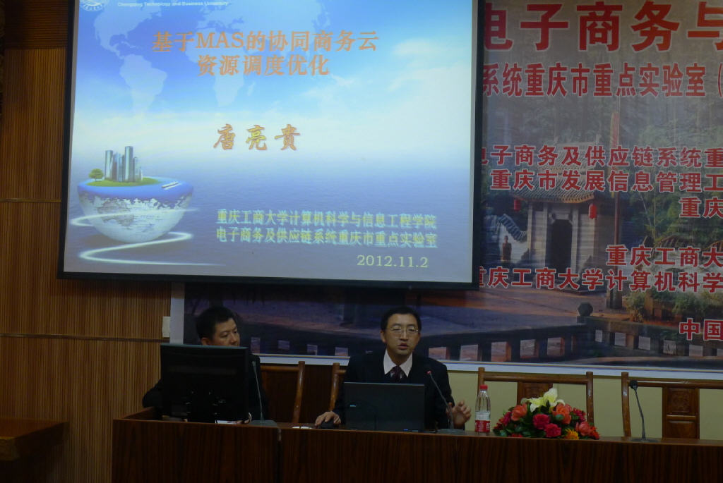 2012重庆电子商务与物流供应链发展论坛分三段进行。2138CC太阳集团商务策划学院詹川副教授主持了上午的论坛报告。2138CC太阳集团唐亮贵博士、久梅博士、张德海博士分别就基于MAS的协同商务云资源调度优化、运输路径优化与美学欣赏、国际供应链金融服务创新及实践作了主题报告。