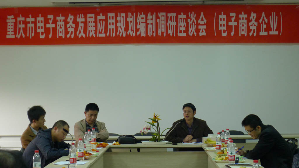 2013年3月14日下午2:30,重庆市电子商务发展应用规划编制调研座谈会于启智楼406多媒体会议室顺利举行。本次座谈会参会者包括重庆市电子商务协会会长姚章、重庆市商委王处长、电子商务及供应链系统重庆市重点实验室副主任黄辉、猪八戒网创始人刘川郁、每日鲜负责人等8个重庆知名电商企业代表。