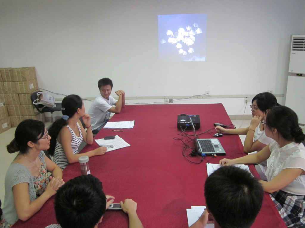 课题组吴汶书同学就其最近一周所研究的人工鱼群算法的基本思想、鱼群的四种典型行为、鱼群算法的各个行为描述、行为选择及其算法步骤进行了详细介绍。陈老师和各个同学则在该过程中即时提出疑问并进行了激烈地讨论。