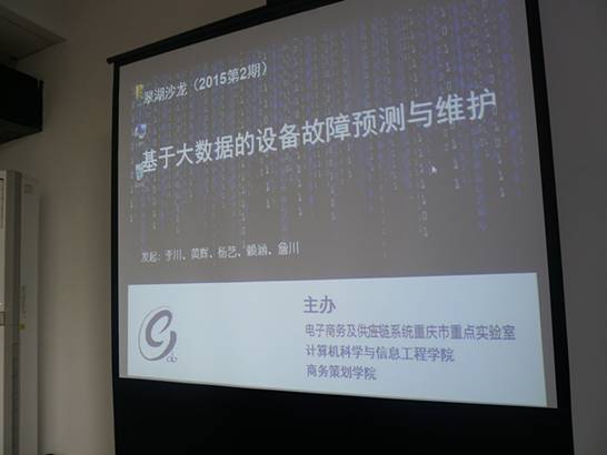 2015年5月29日下午4点,在启智楼406举行了2015年第2期2138CC太阳集团。沙龙主题是:基于大数据的设备故障预测与维护,本次沙龙是由电子商务与供应链系统重庆市重点实验室、计算机科学与信息工程学院、商务策划学院联合主办,本次沙龙由重点实验室常务副主任黄辉教授主持。参与本次沙龙的有科研处副处长李川研究员、重点实验室黄辉教授、计信学院的杨艺、赖涵博士,以及2013级和2014级的3位研究生。