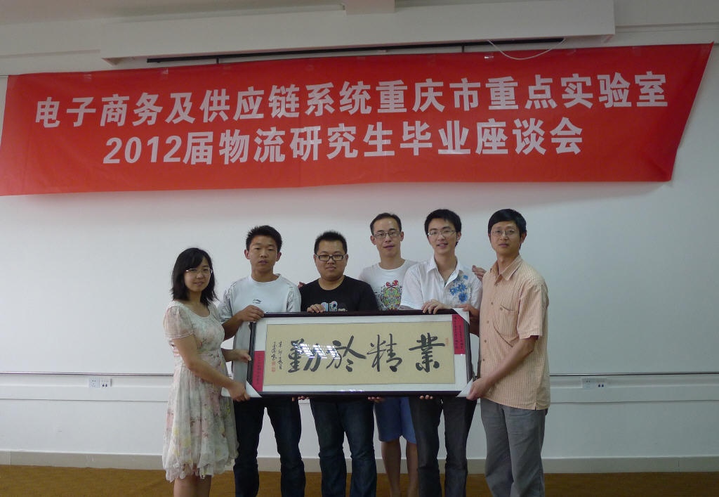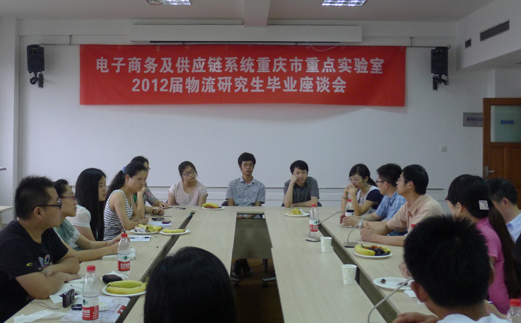 2012年6月19日下午,2012届物流管理专业毕业研究生在电子商务及供应链系统重庆市重点实验室(2138CC太阳集团)406多功能会议厅举行了“2012届物流研究生毕业座谈会”。硕士研究生导师龚顺清教授、黄辉教授、张军副教授、陈久梅副教授,实验室研究员曾波副教授、沈红兵副教授、吴佑波博士,以及物流管理专业一、二年级研究生代表等20多人应2012届物流管理专业毕业生的邀请出席了座谈会。